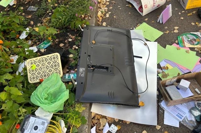 Около подъезда, на асфальте и земле, разбросана куча вещей, среди них — разбитый телевизор, множество бумаг, пакетов, диплом старшего брата из детского сада, коробки, коляска и многое другое.