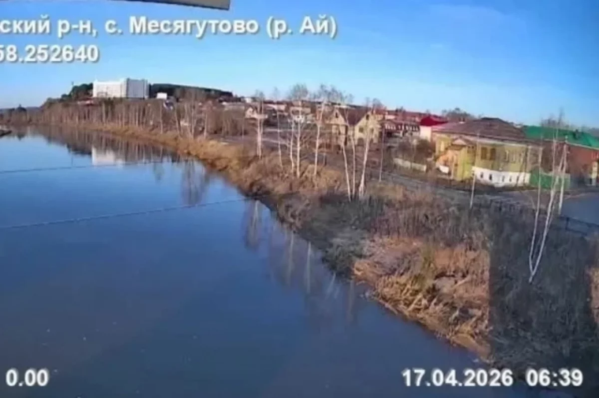 Река Ай у села Месягутово Дуванского района поднялась за сутки на 7 см, текущий уровень 191 см, выход реки на пойму 374 см.