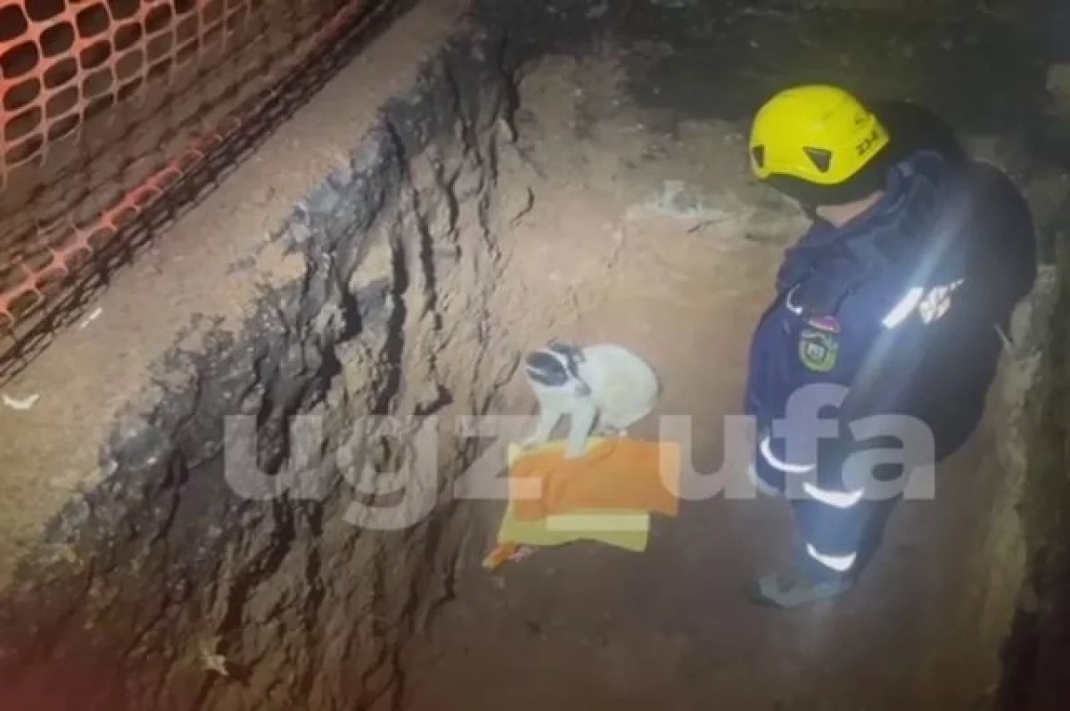 Недалеко от кинотеатра «Смена» на улице Российской в Уфе ночью собака провалилась в яму, забежав за ограждение. Очевидцы вызвали спасателей.