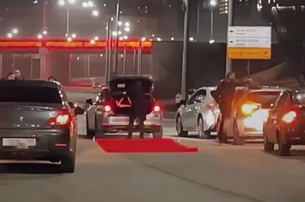 На записи видно, что для проезда были временно закрыты три полосы, по одной из них расстелили красную дорожку. Жених пригласил друзей, купил большой букет красных роз, а на билборде высветилась надпись «Выходи за меня!».