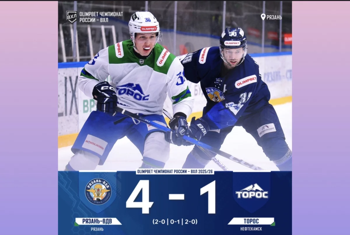 В очередном поединке Чемпионата ВХЛ сезона 2025/26 нефтекамский «Торос» проиграл. Он уступил в гостях «Рязань-ВДВ» со счетом 1:4.